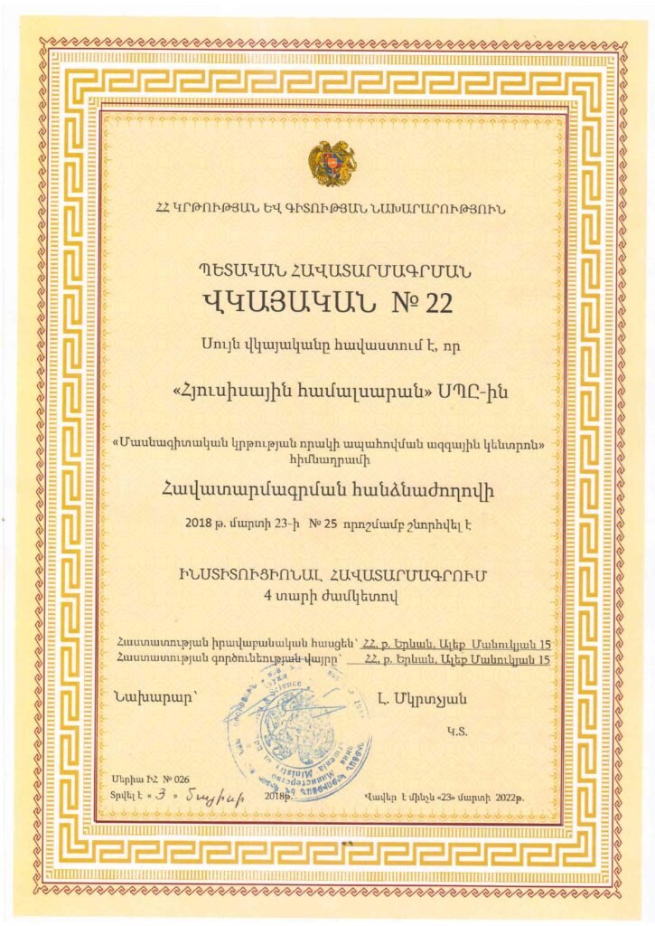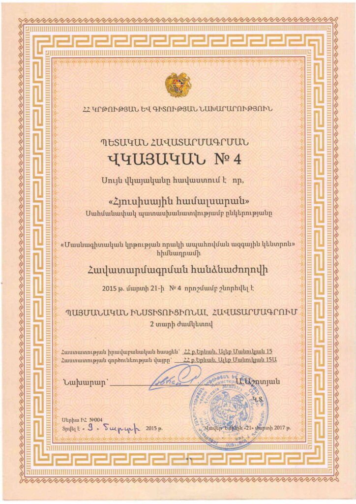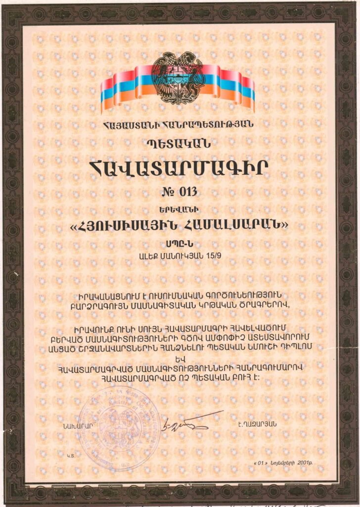 ՀՅՈՒՍԻՍԱՅԻՆ ՀԱՄԱԼՍԱՐԱՆԸ ՀԱՎԱՏԱՐՄԱԳՐՎԱԾ ԲՈՒՀ Է ԵՎ ՏՐԱՄԱԴՐՈՒՄ Է ՊԵՏԱԿԱՆ ԴԻՊԼՈՄ